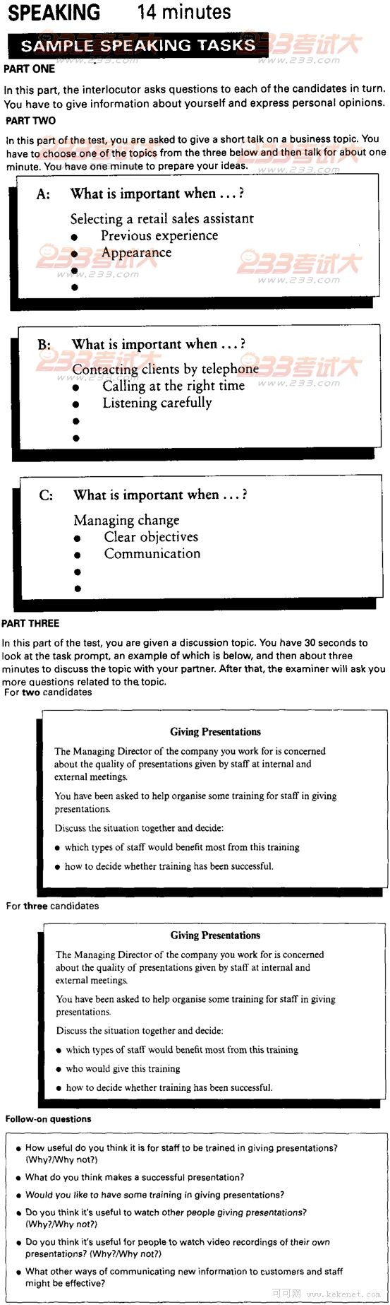 SPEAKING14 minutes SAMPLE SPEAKING TASKS PART ONE In this part, the interlocutor asks questions to each of the candidates in turn. You have to give information about yourself and exp2011-06-10 编辑:Amy 标签: