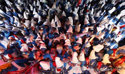 25日,世界各地超过4千人装扮成这一比利时卡通形象来庆祝“蓝精灵全球欢度日”。