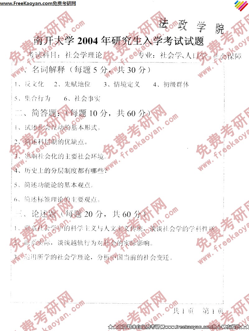 南开大学2004年社会学(社会学理论)专业课考研真题试卷