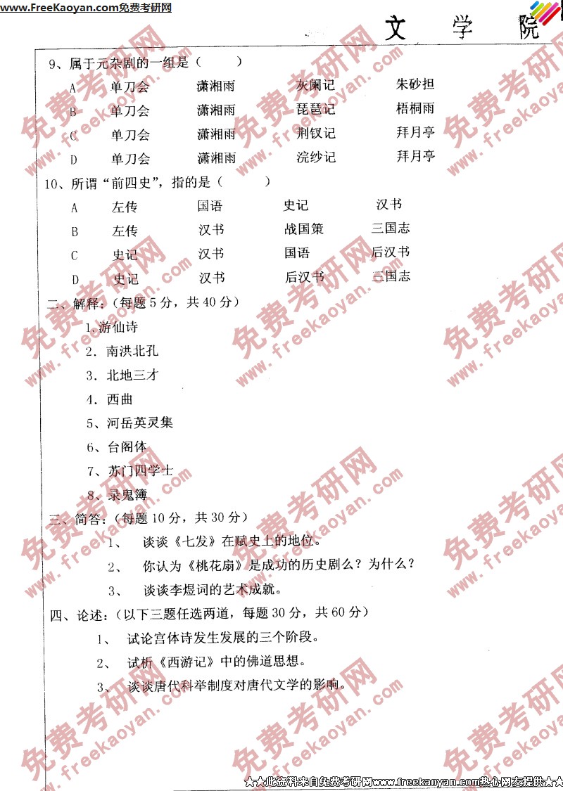 南开大学2004年中国古代文学(中国文学史)专业课考研真题试卷