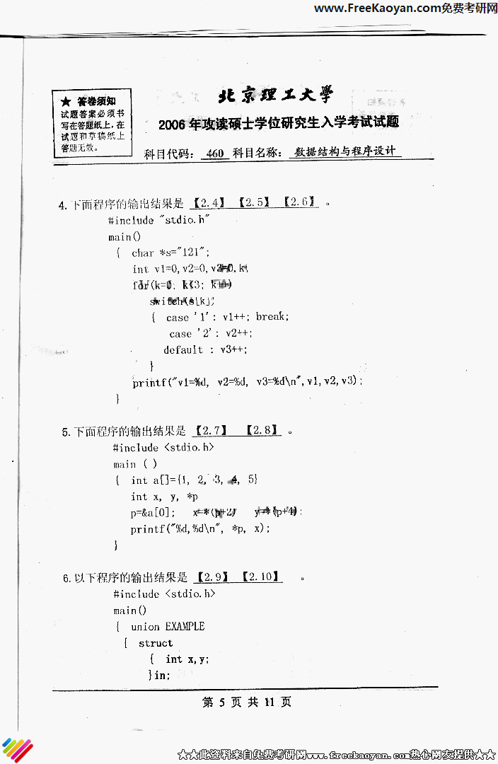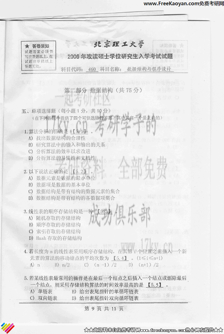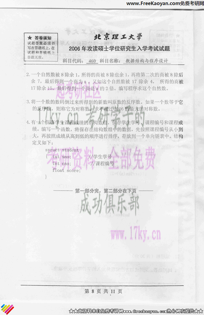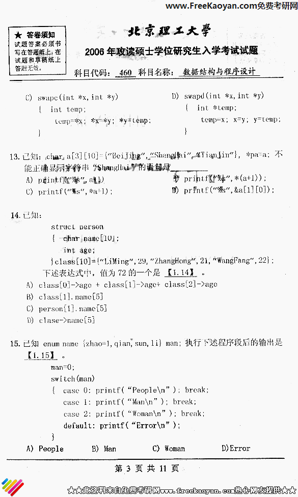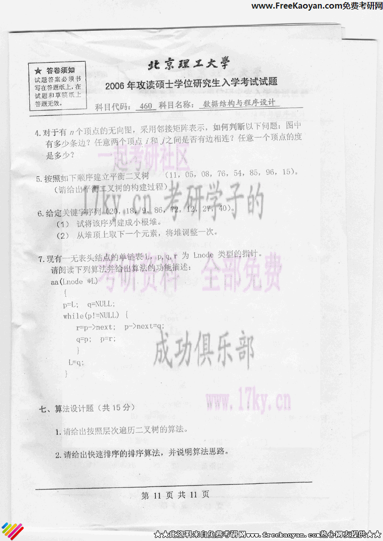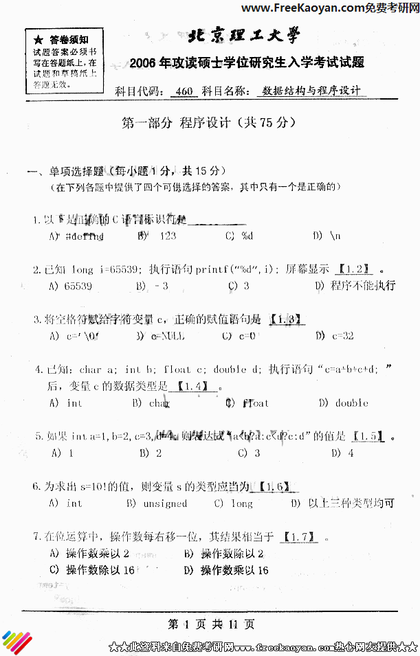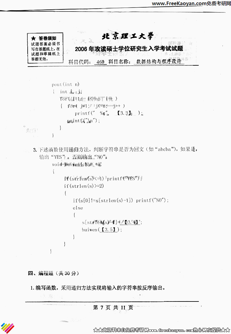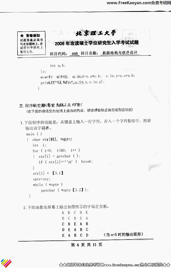 北京理工大学2006年数据结构与程序设计专业课考研真题试卷