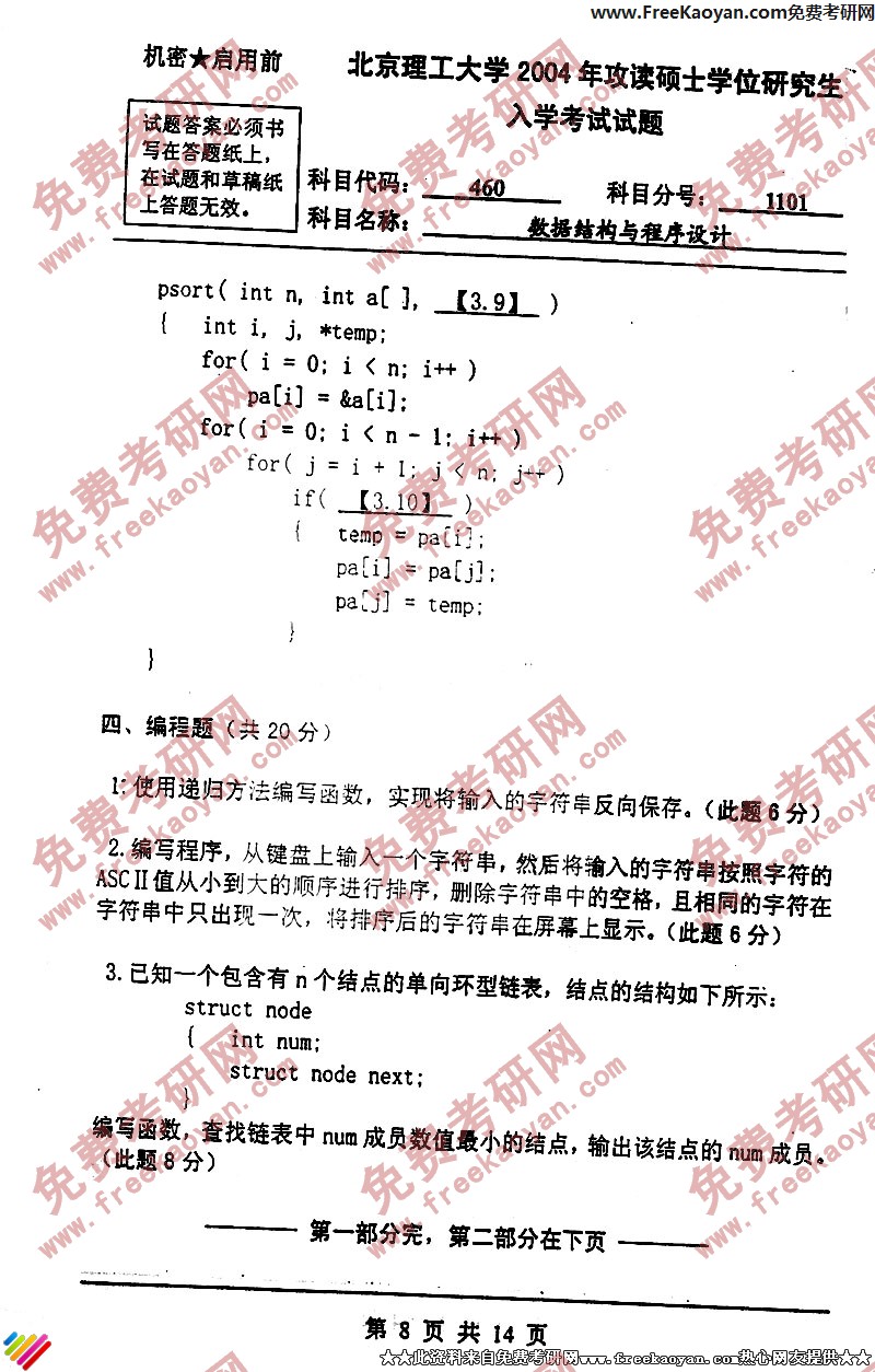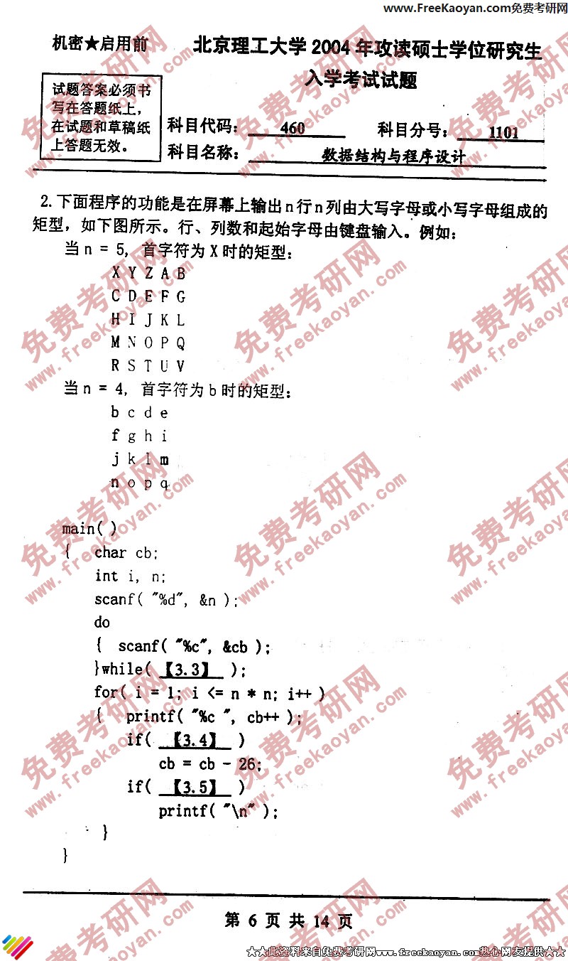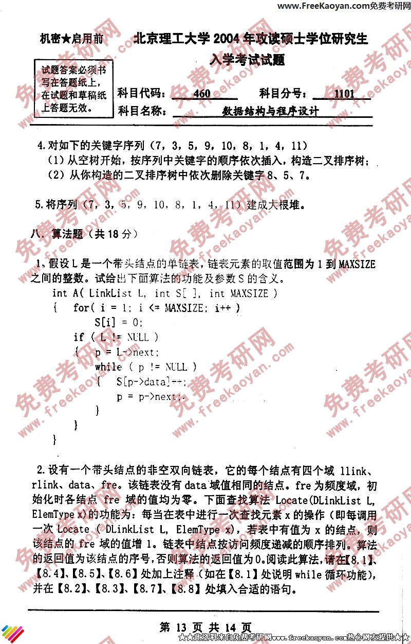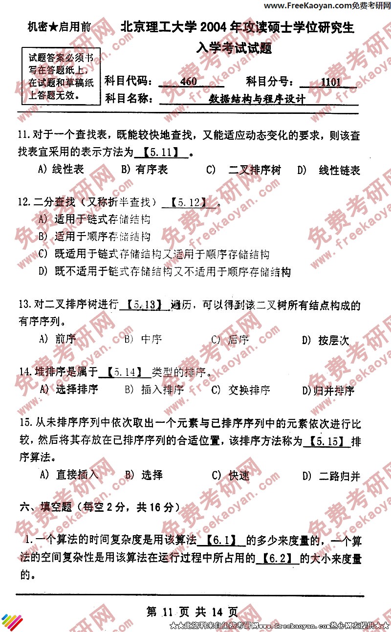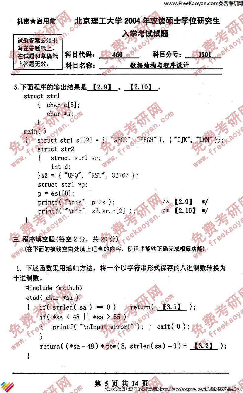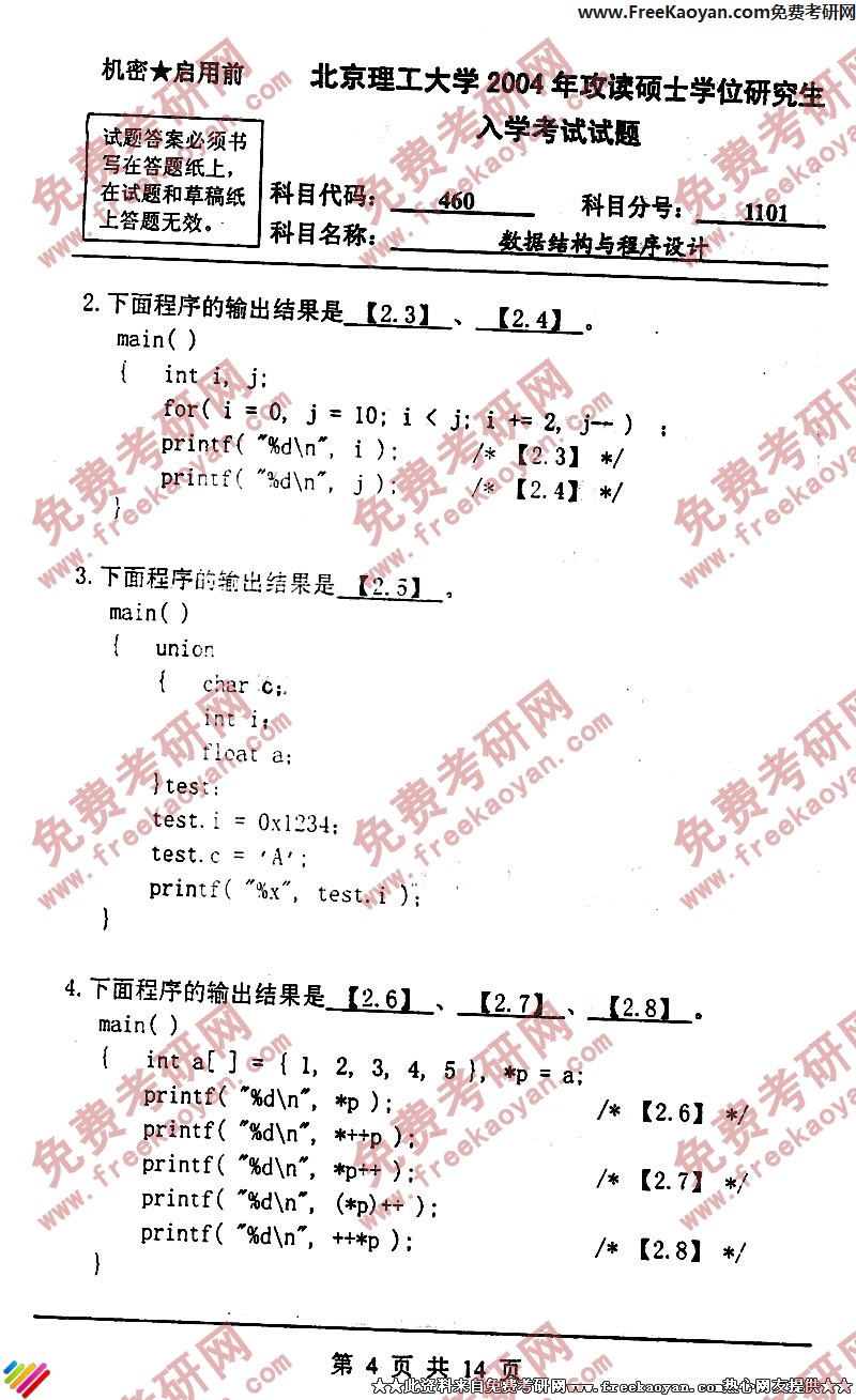 北京理工大学2004年数据结构与程序设计专业课考研真题试卷