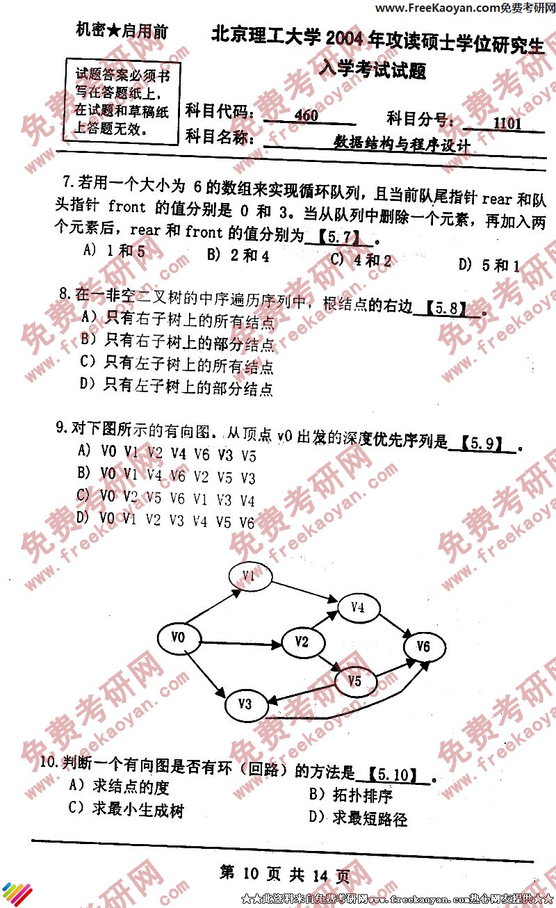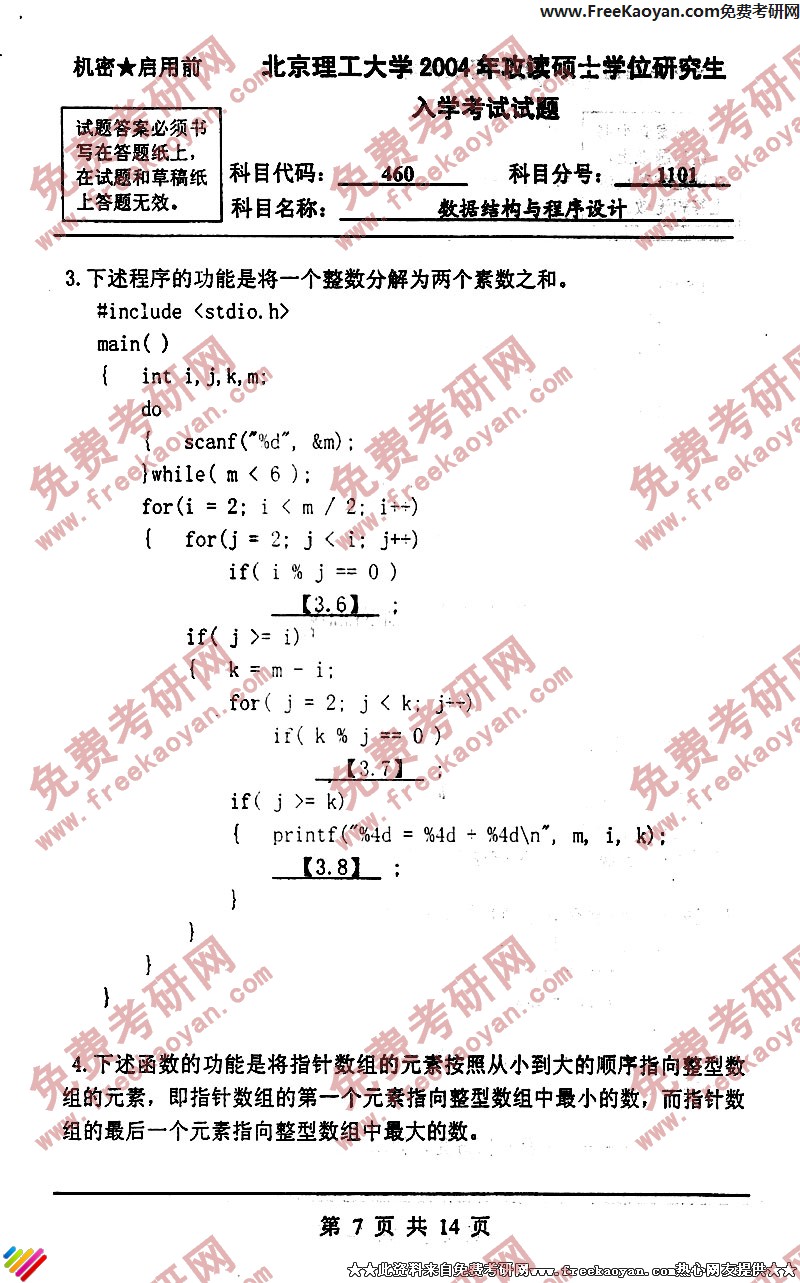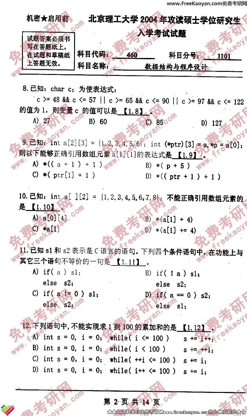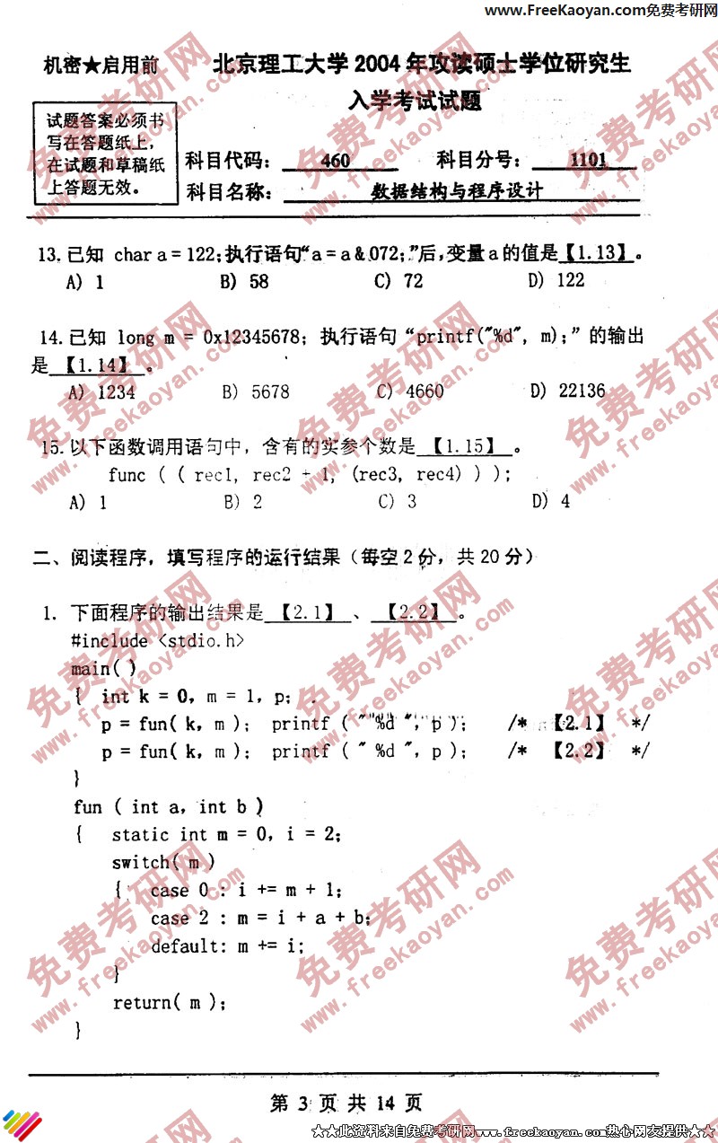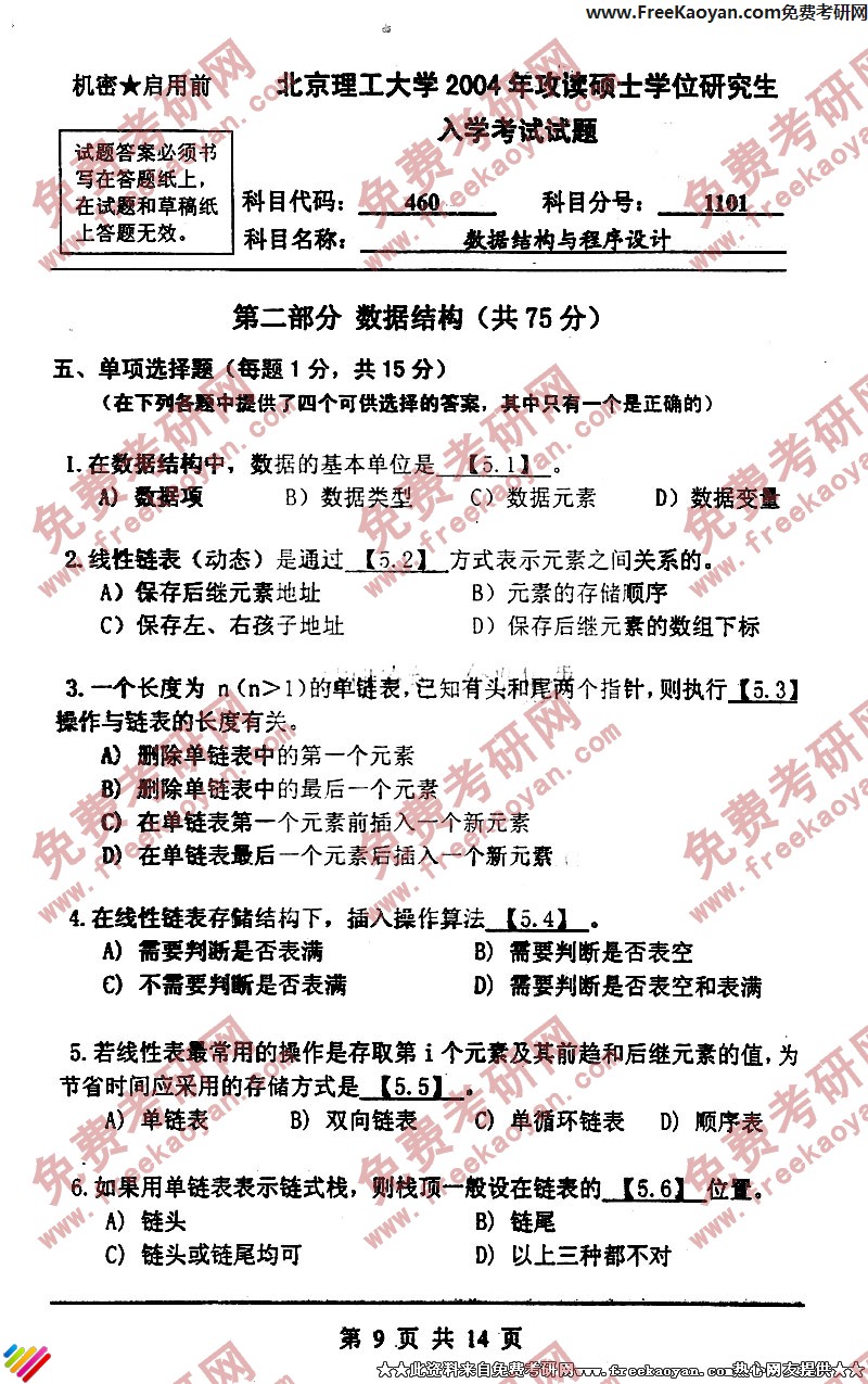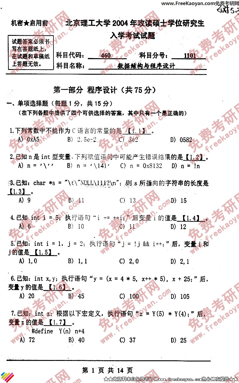 北京理工大学2004年数据结构与程序设计专业课考研真题试卷