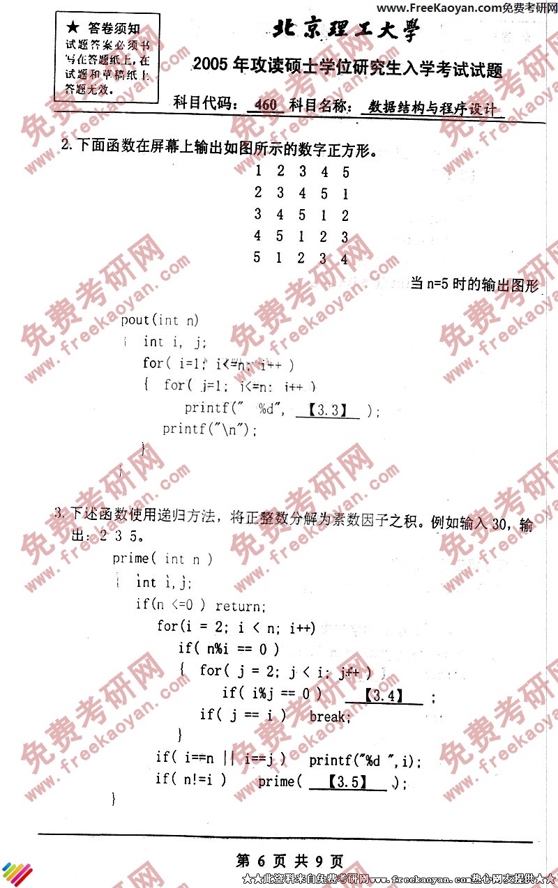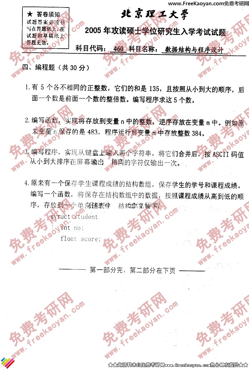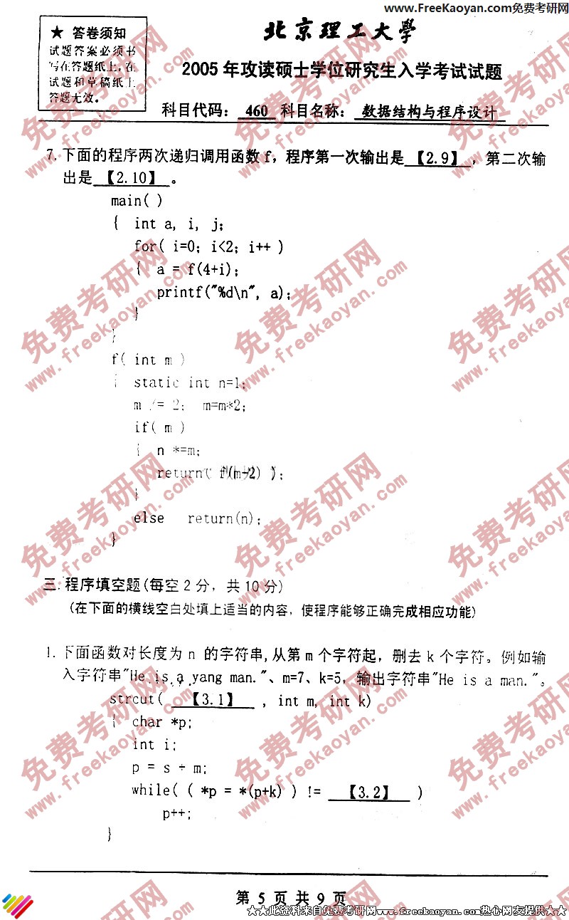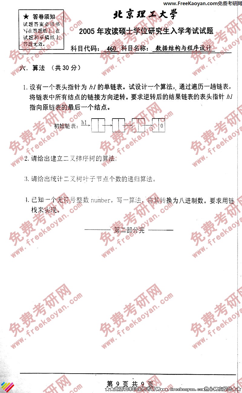 北京理工大学2005年数据结构与程序设计专业课考研真题试卷