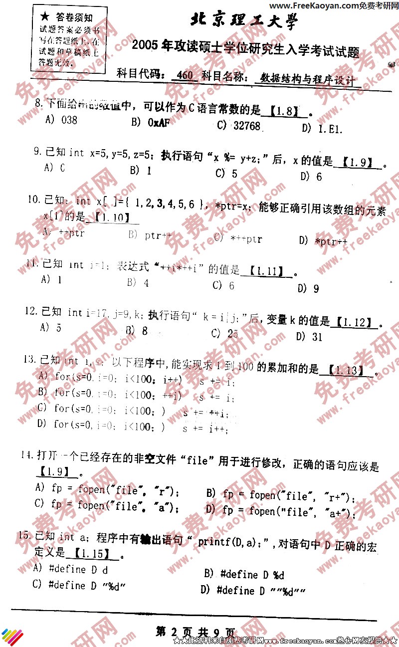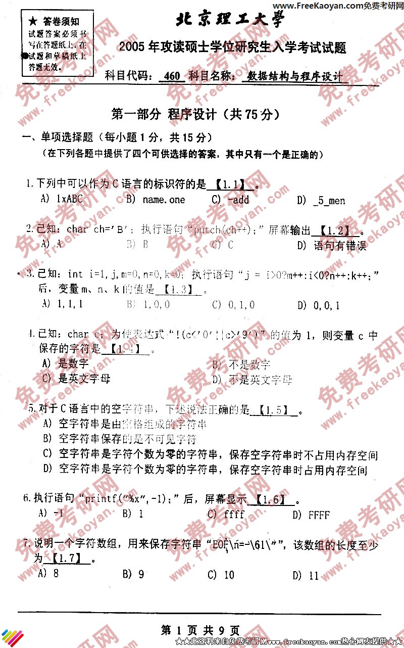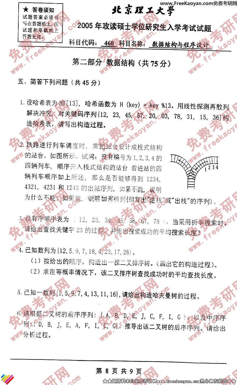 北京理工大学2005年数据结构与程序设计专业课考研真题试卷