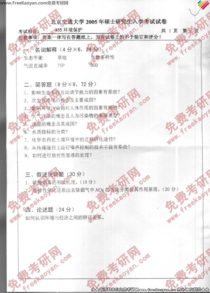 北京交通大学2005年环境管理概论专业课考研真题试卷