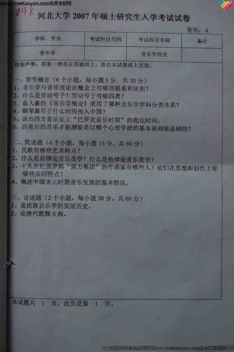 河北大学2007年音乐学(音乐学理论)专业课考研真题试卷