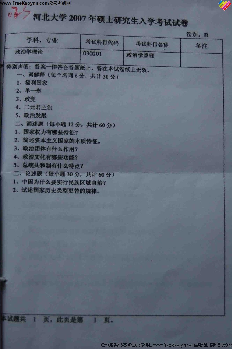 河北大学2007年政治学理论(政治学原理)专业课考研真题试卷