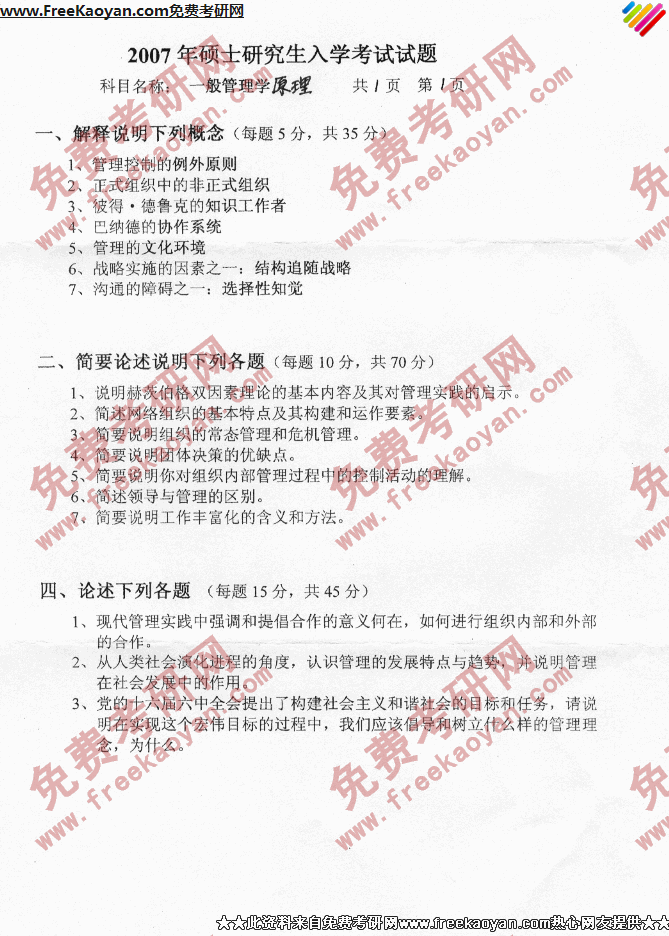 燕山大学2007年一般管理学原理专业课考研真题试卷
