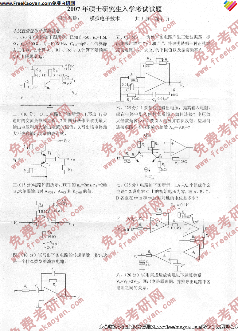 燕山大学2007年模拟电子技术专业课考研真题试卷