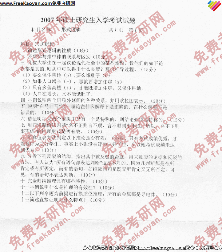 燕山大学2007年形式逻辑专业课考研真题试卷