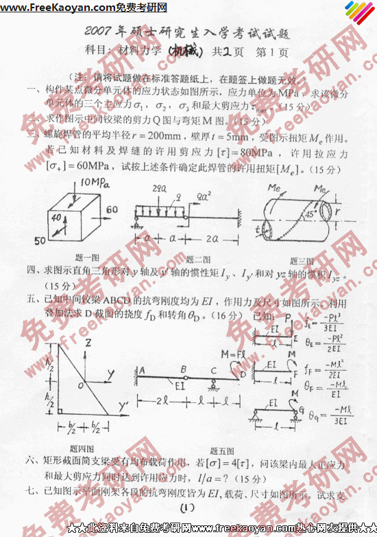 燕山大学2007年材料力学(机械)专业课考研真题试卷