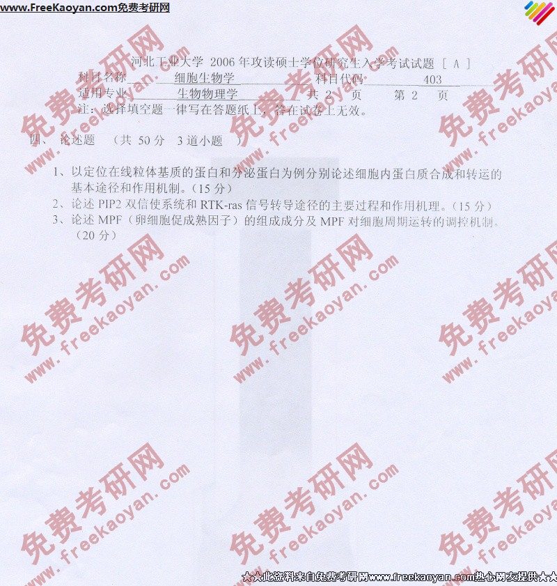 河北工业大学2006年生物物理学(细胞生物学)专业课考研真题试卷
