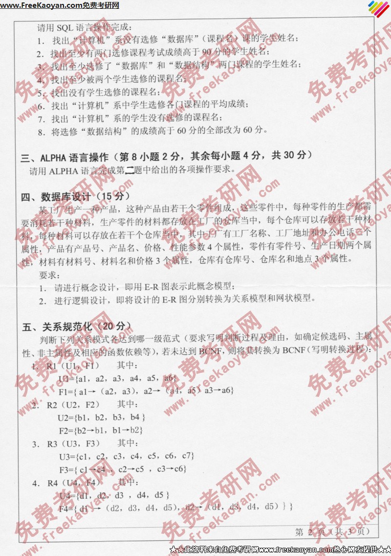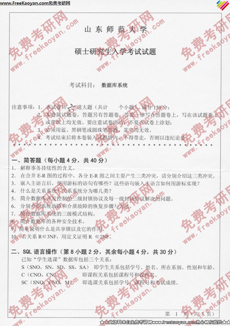 山东师范大学2006年数据库系统专业课考研真题试卷