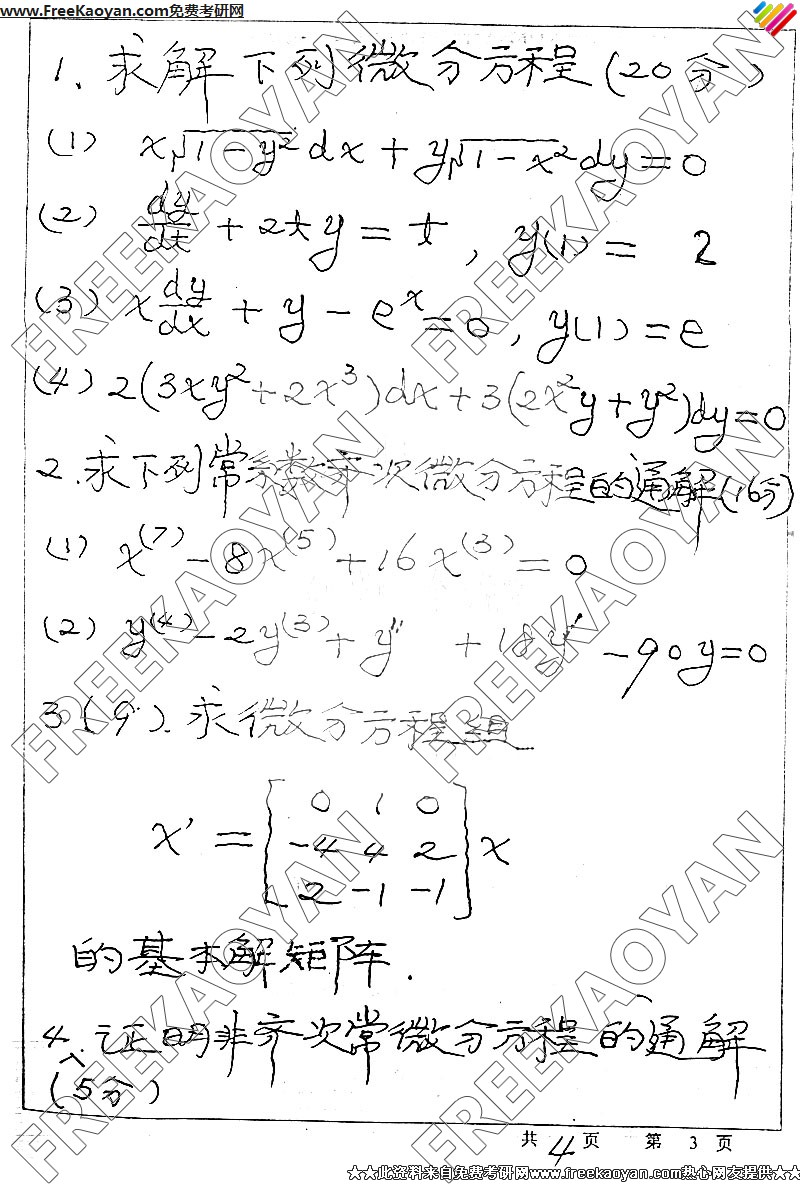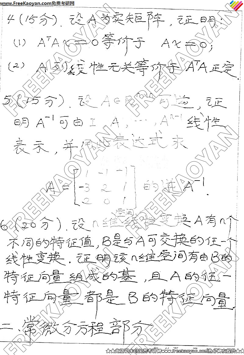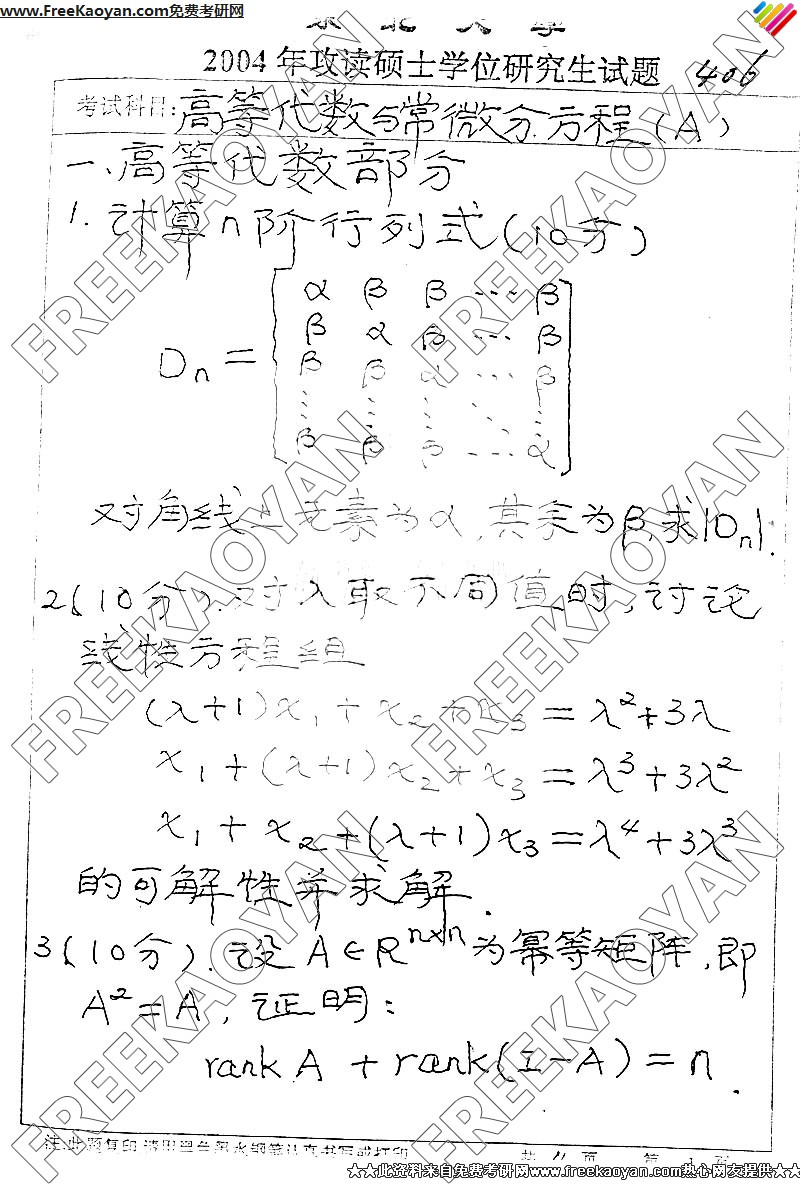 东北大学2004年高等代数与常微分方程(A)专业课考研真题试卷