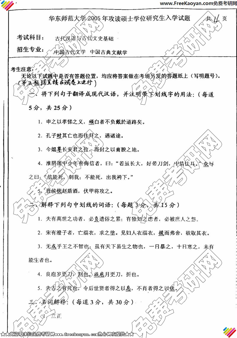 华东师范大学2005年古代汉语与古代文史基础专业课考研真题试卷