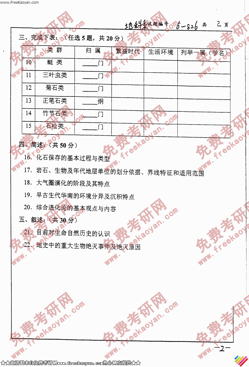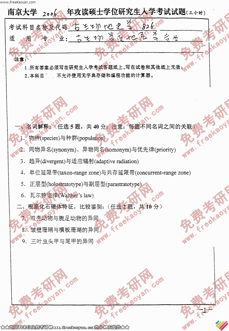 南京大学2006年古生物学及地质学(古生物地史学)专业课考研真题试卷