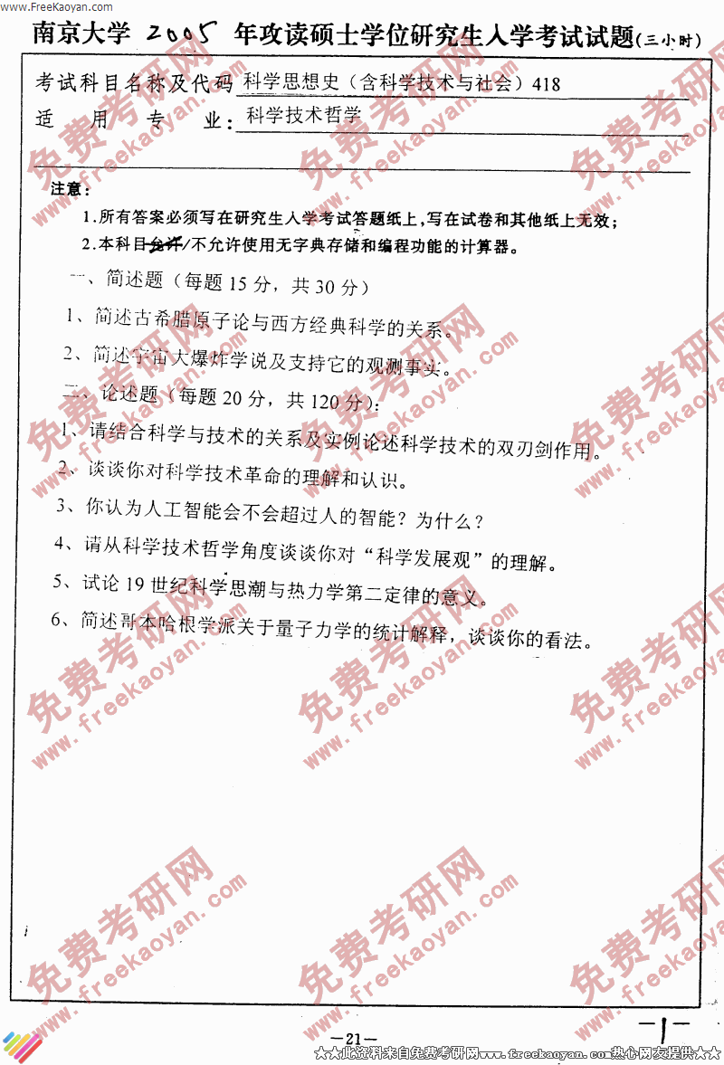 南京大学2005年科学思想史专业课考研真题试卷