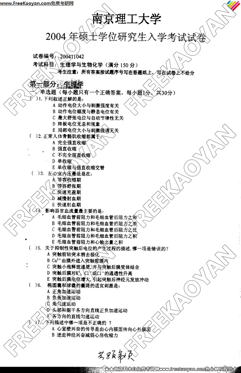 南京理工大学2004年生理学与生物化学专业课考研真题试卷