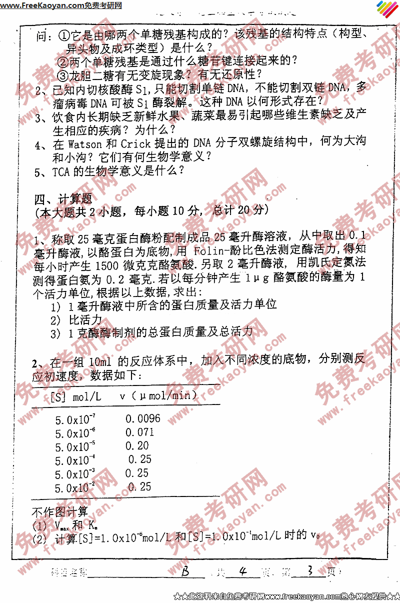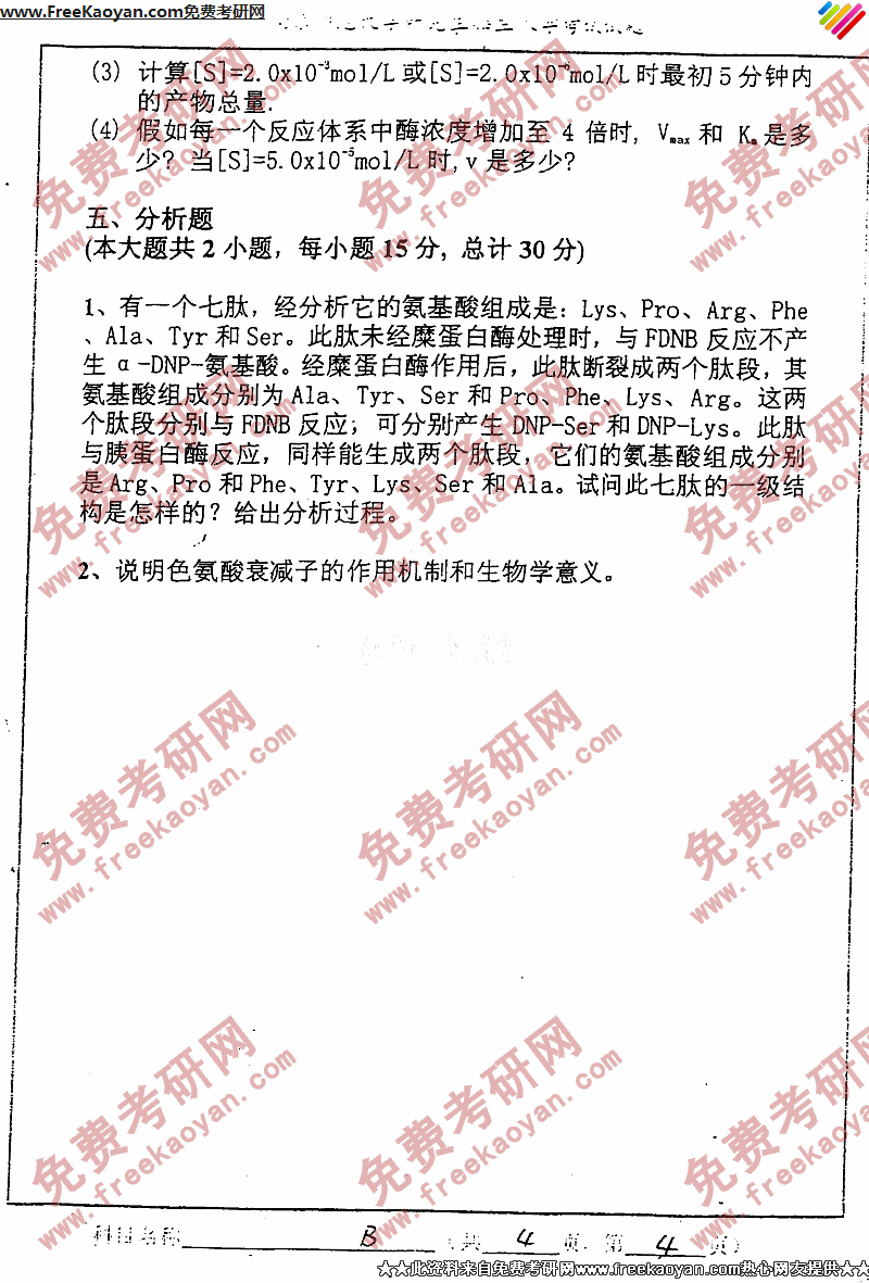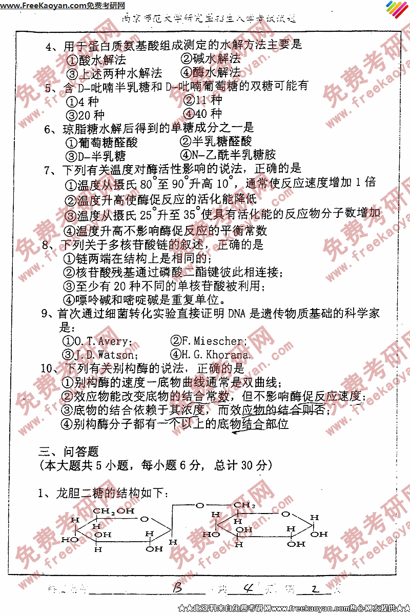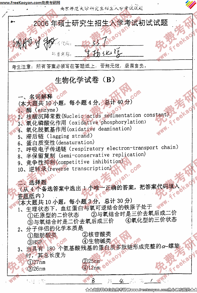 南京师范大学2006年生物化学B卷专业课考研真题试卷