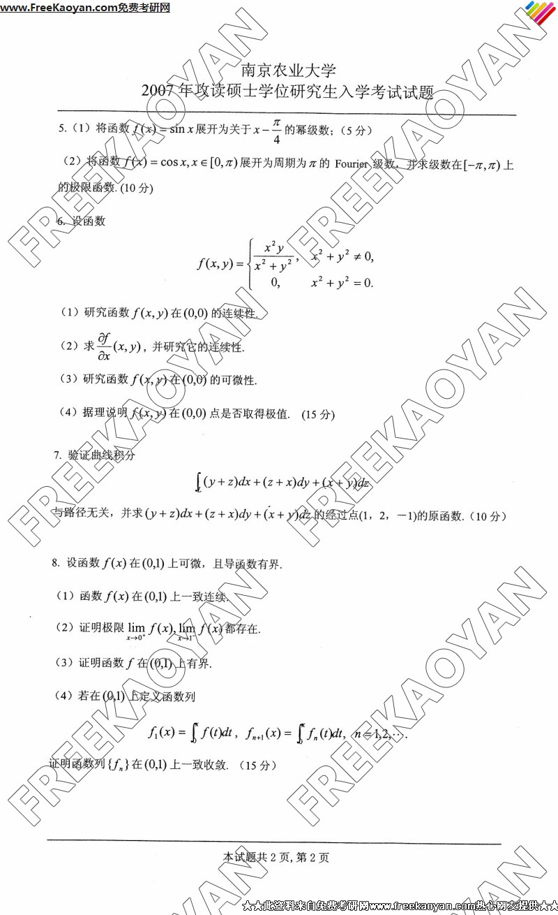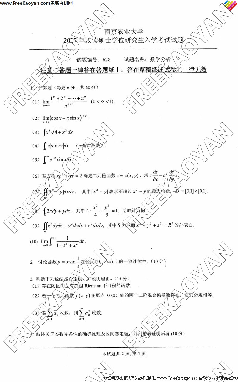 南京农业大学2007年数学分析专业课考研真题试卷