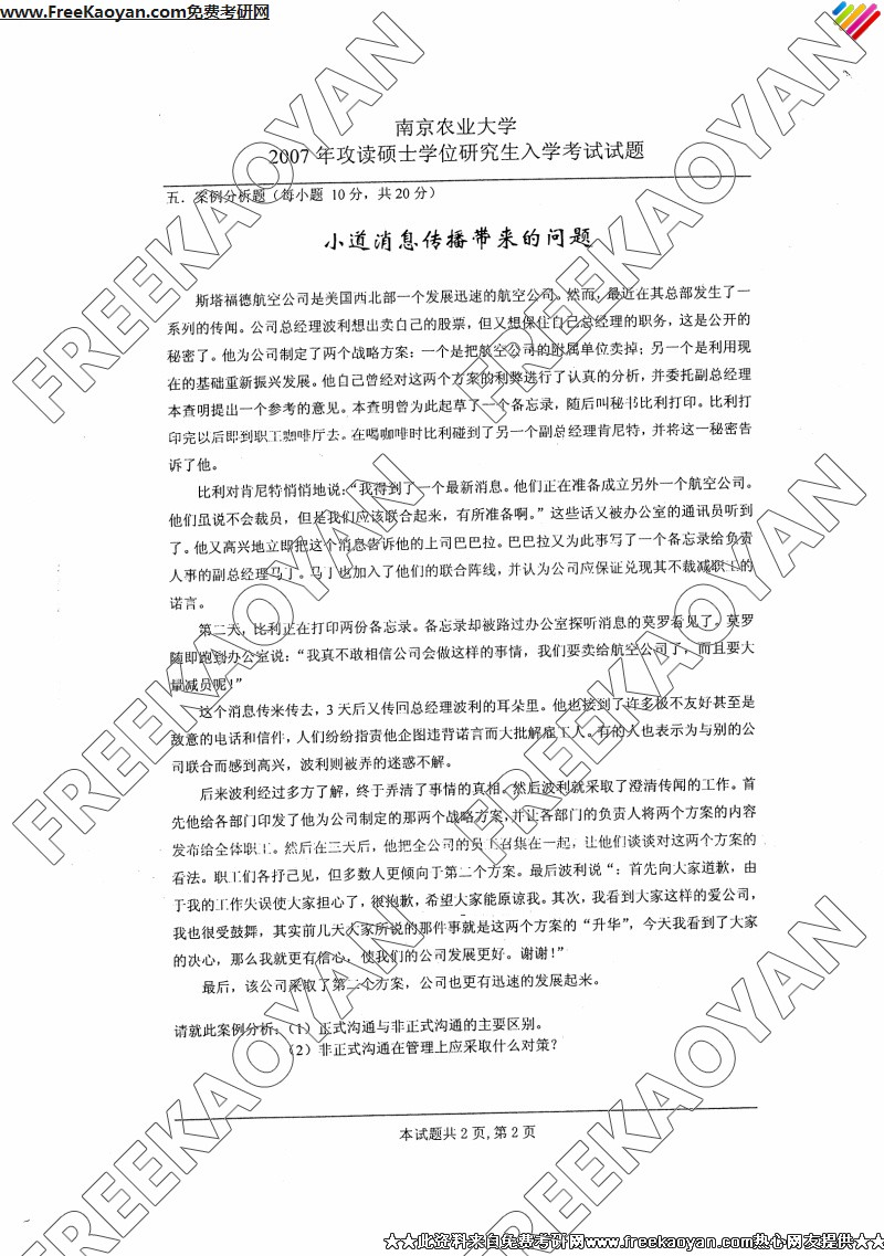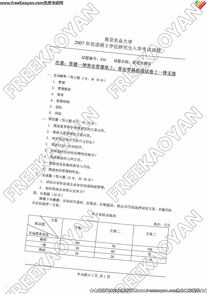 南京农业大学2007年管理学概论专业课考研真题试卷