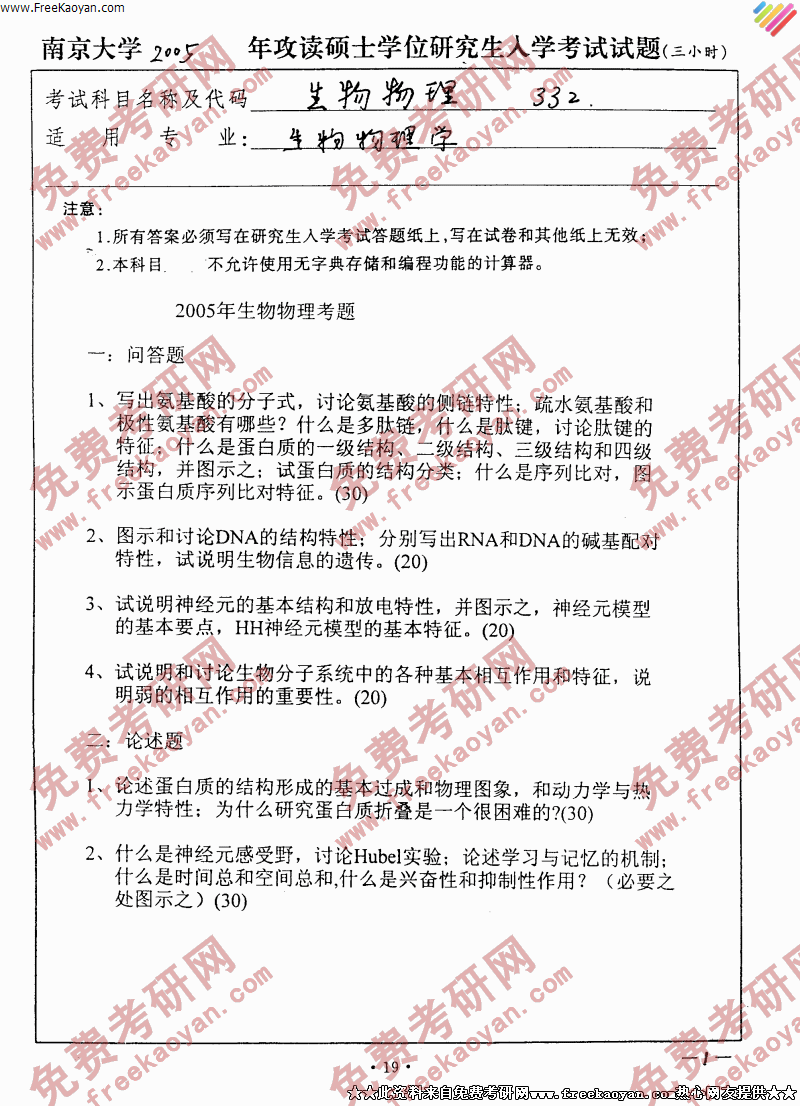 南京大学2005年生物物理专业课考研真题试卷