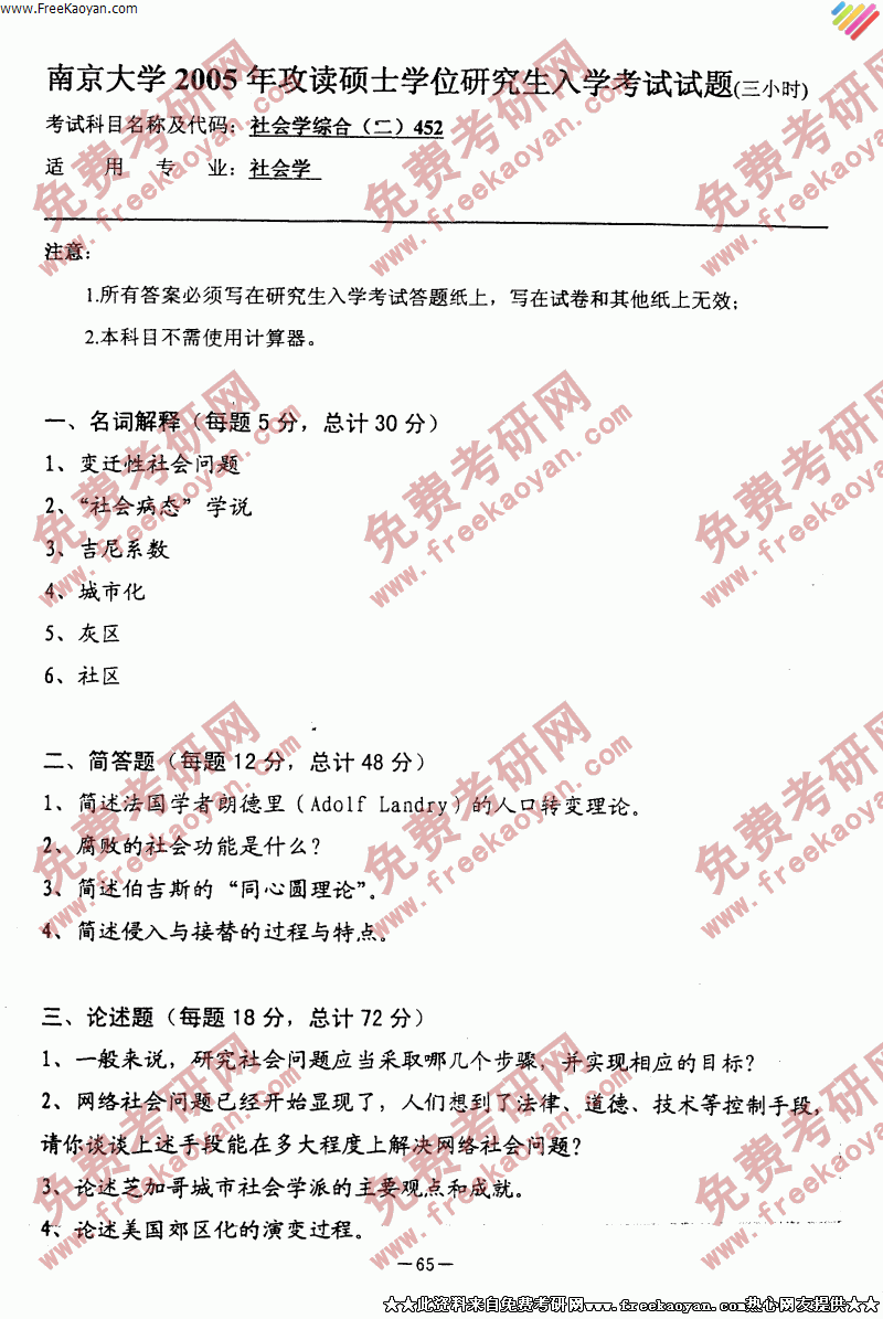 南京大学2005年社会学综合(二)专业课考研真题试卷