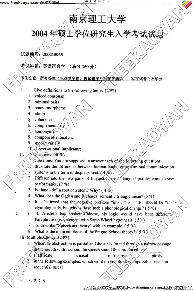 南京理工大学2004年英语语言学专业课考研真题试卷