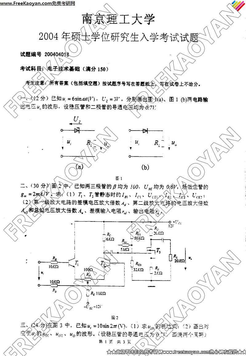 南京理工大学2004年电子技术基础专业课考研真题试卷