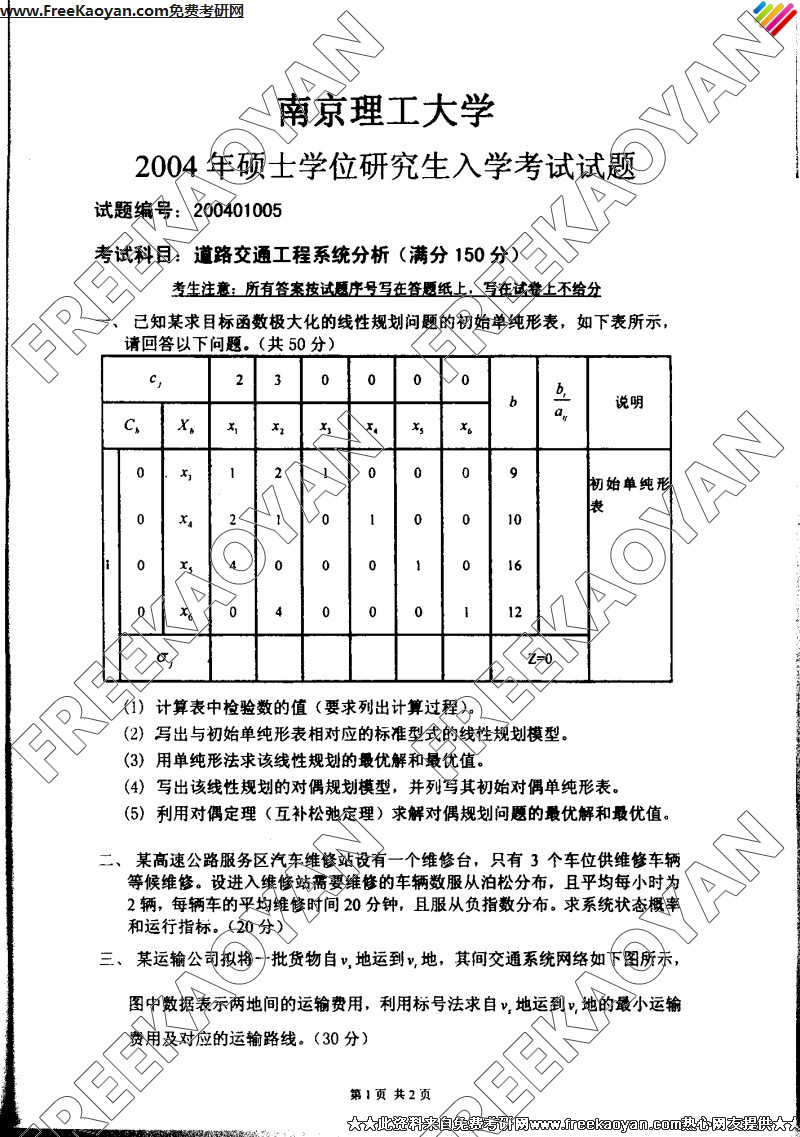 南京理工大学2004年道路交通工程系统分析专业课考研真题试卷