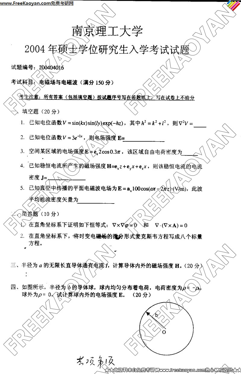 南京理工大学2004年电磁场与电磁波专业课考研真题试卷
