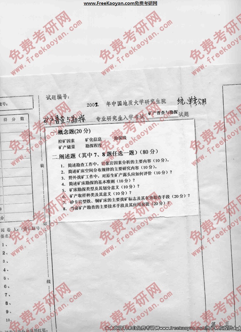 中国地质大学(武汉)2002年矿产普查与勘探专业课考研真题试卷