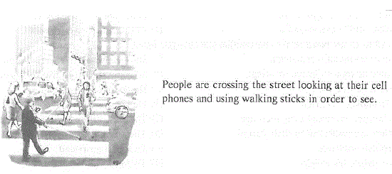 As is shown in the picture, having a mobile phone in hand and at the ready is the default mode while walking on the streets. What this cartoon symbolically reveals is that people nowadays, especially young people, are growing increasingly dependent on their mobile phones.