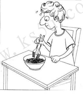 What an interesting picture! A Western young man, sitting at a table, is ready to eat a bowl of noodles. He is holding two forks the same way as we Chinese hold chopsticks. He is trying so hard to pick up the noodles that he is sweating a lot. At first glance, I think it’s a bit funny, for we Chinese take for granted that chopsticks are the tools for eating noodles. The man in the picture is trying to copy us. Obviously he is doing it the hard way. Maybe using one fork will do a better job, In my opinion, we don’t need to copy others’ ways of thinking. Sometimes a simpler way of doing things may be a better way.